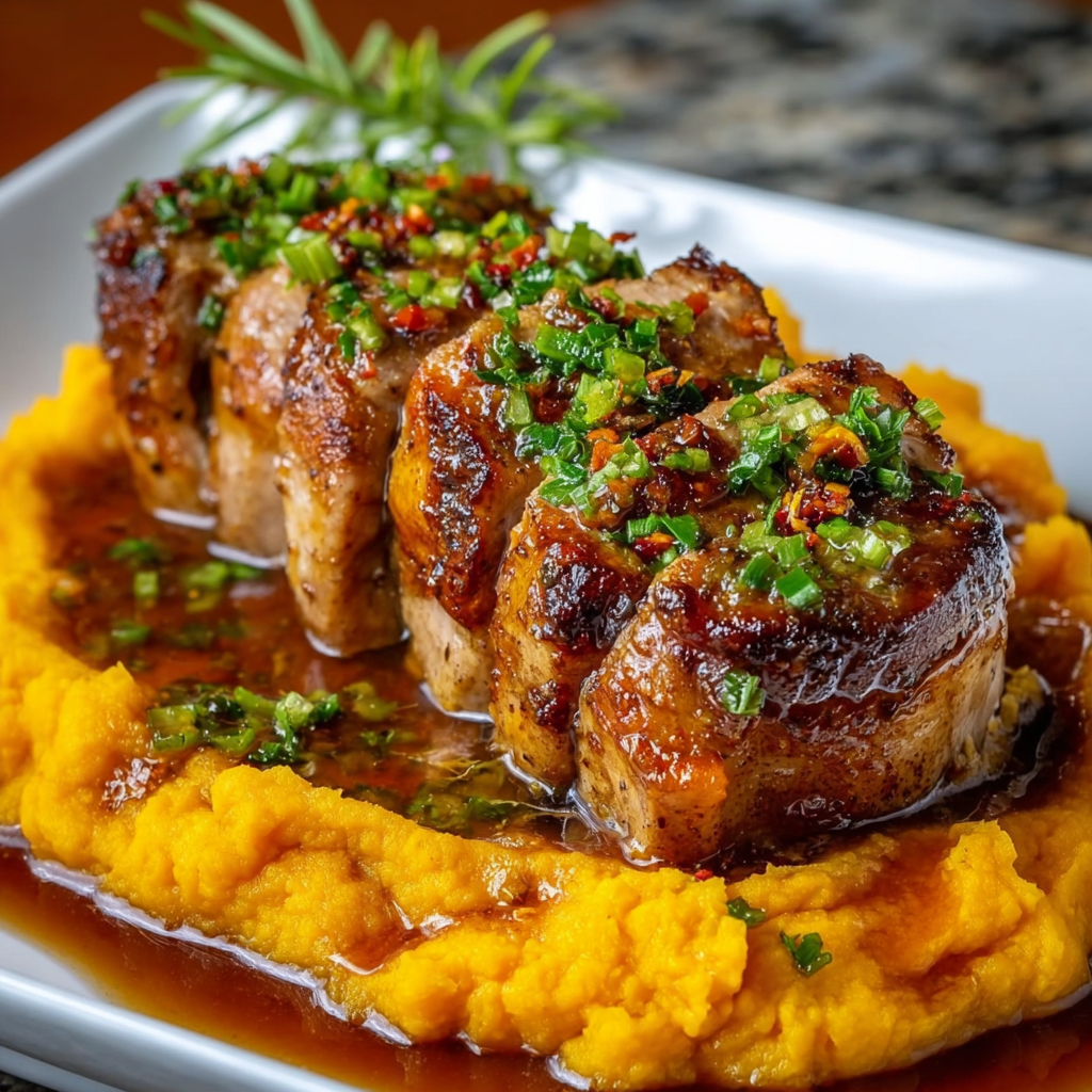 - Plate the Dish: To serve, spoon some creamy mashed sweet potatoes onto the center of each plate. Arrange the pork medallions nicely on top.