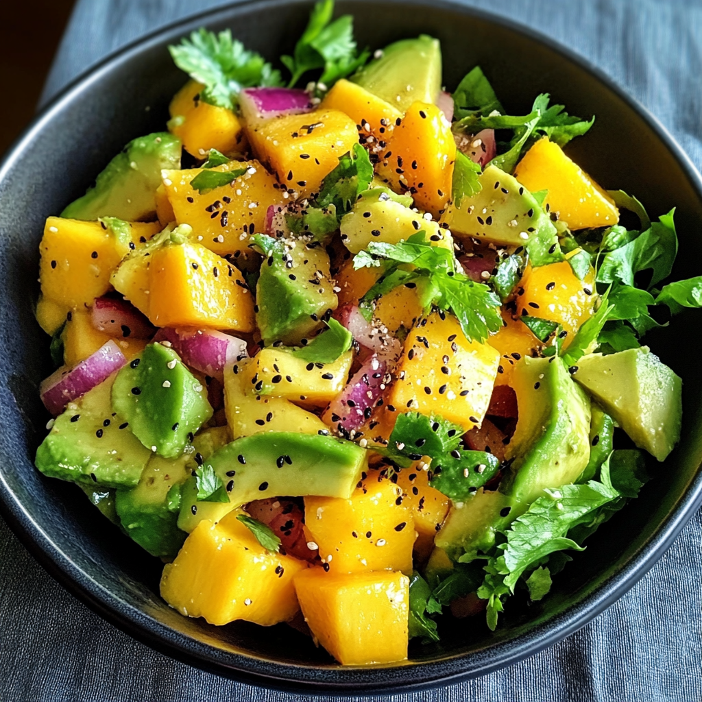 Alright, let’s talk about why this salad is not just delicious but also packed with nutrients! Mangoes are loaded with vitamins A and C, which are fabulous for your skin and immune system. Avocados, on the other hand, give you healthy fats that keep your heart happy. The addition of cherry tomatoes and onions provides antioxidants that help combat inflammation. So, every bite of this salad not only tastes amazing but also gives you a boost of goodness!