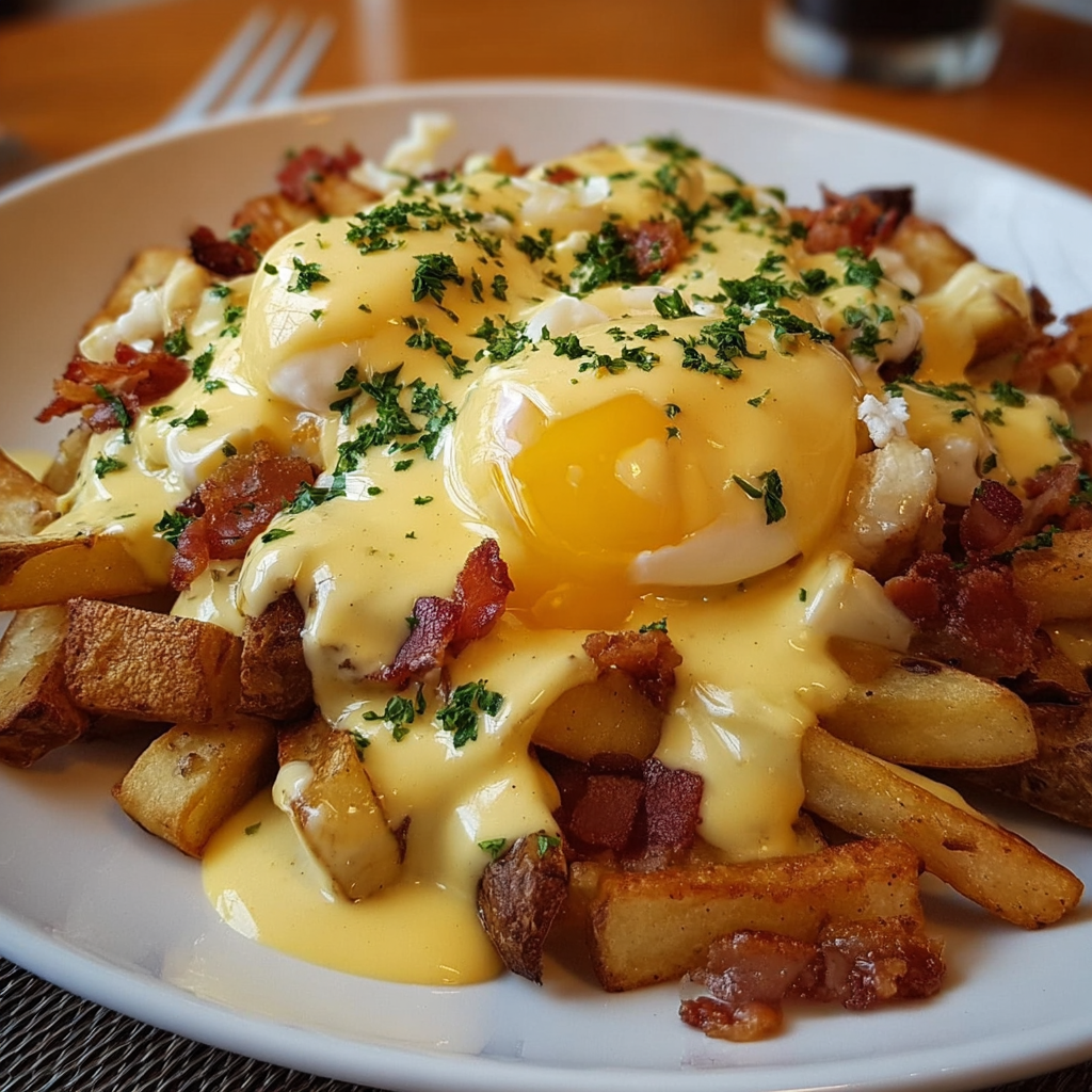 - Pour that warm hollandaise sauce generously over the fries and bacon, and then carefully add a fried egg on top of each serving.