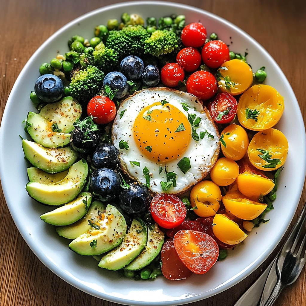 This delightful dish you’re about to create is not only visually stunning but also packed with nutrition! Eggs are a fantastic source of high-quality protein and contain essential vitamins like B12 and D. The vibrant array of vegetables and fruits brings additional benefits: