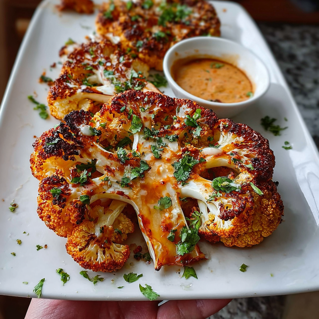 - Transfer those beautiful buffalo cauliflower steaks to a serving platter, sprinkle some fresh parsley or cilantro on top for a lovely pop of color, and serve them hot with the dipping sauce on the side. Enjoy!