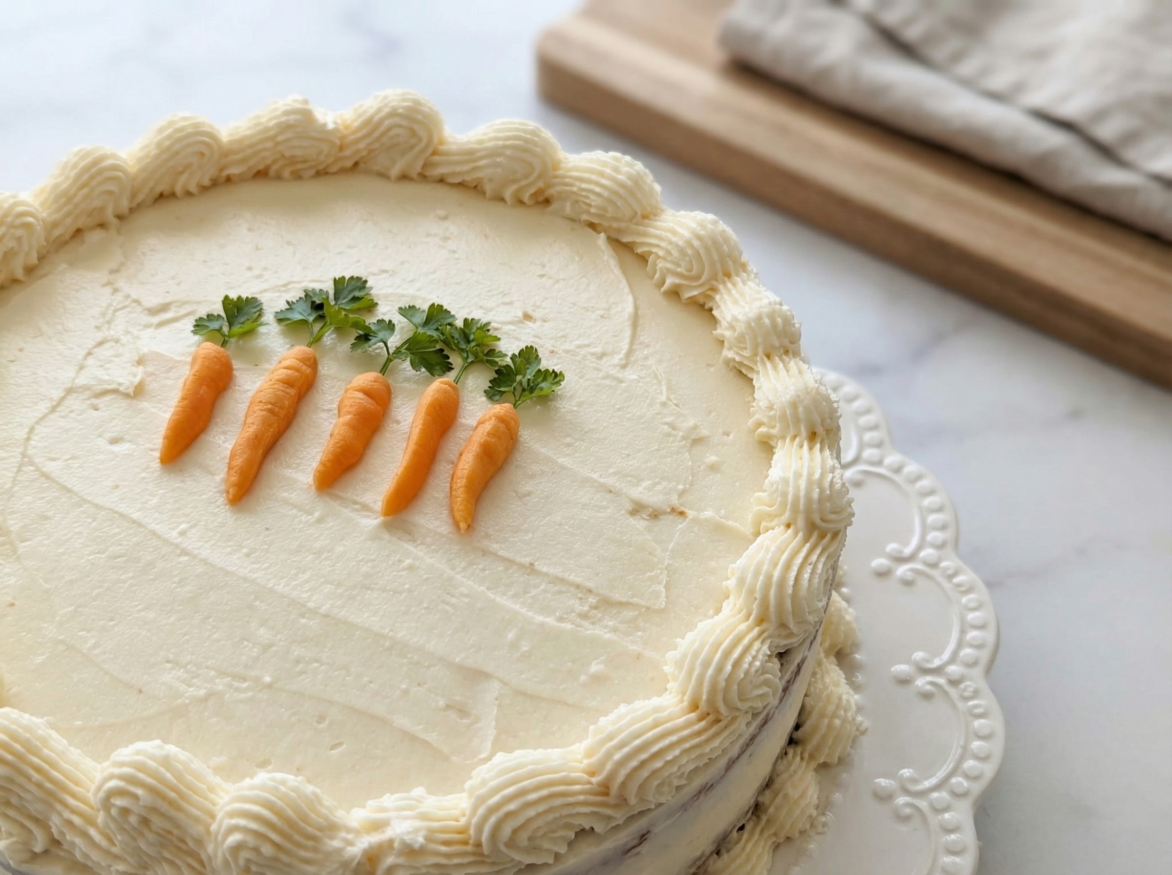 - Decorate the top with little carrot shapes using small baby carrots or fondant with some fresh parsley or carrot greens for the “tops.”