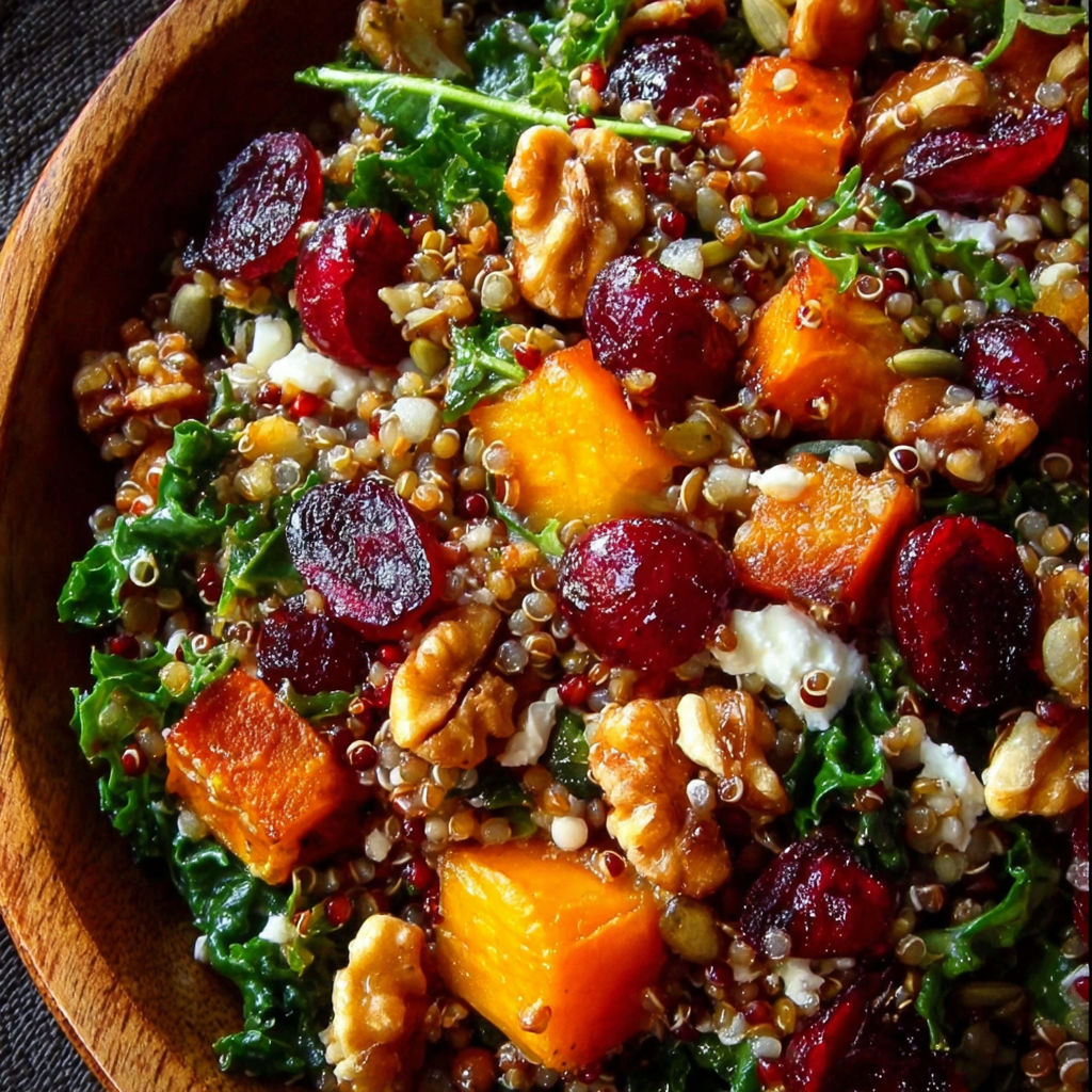 - In a large mixing bowl, combine the cooked grains, massaged kale, roasted butternut squash, dried cranberries, toasted walnuts, pumpkin seeds, and crumbled feta or goat cheese (if using).