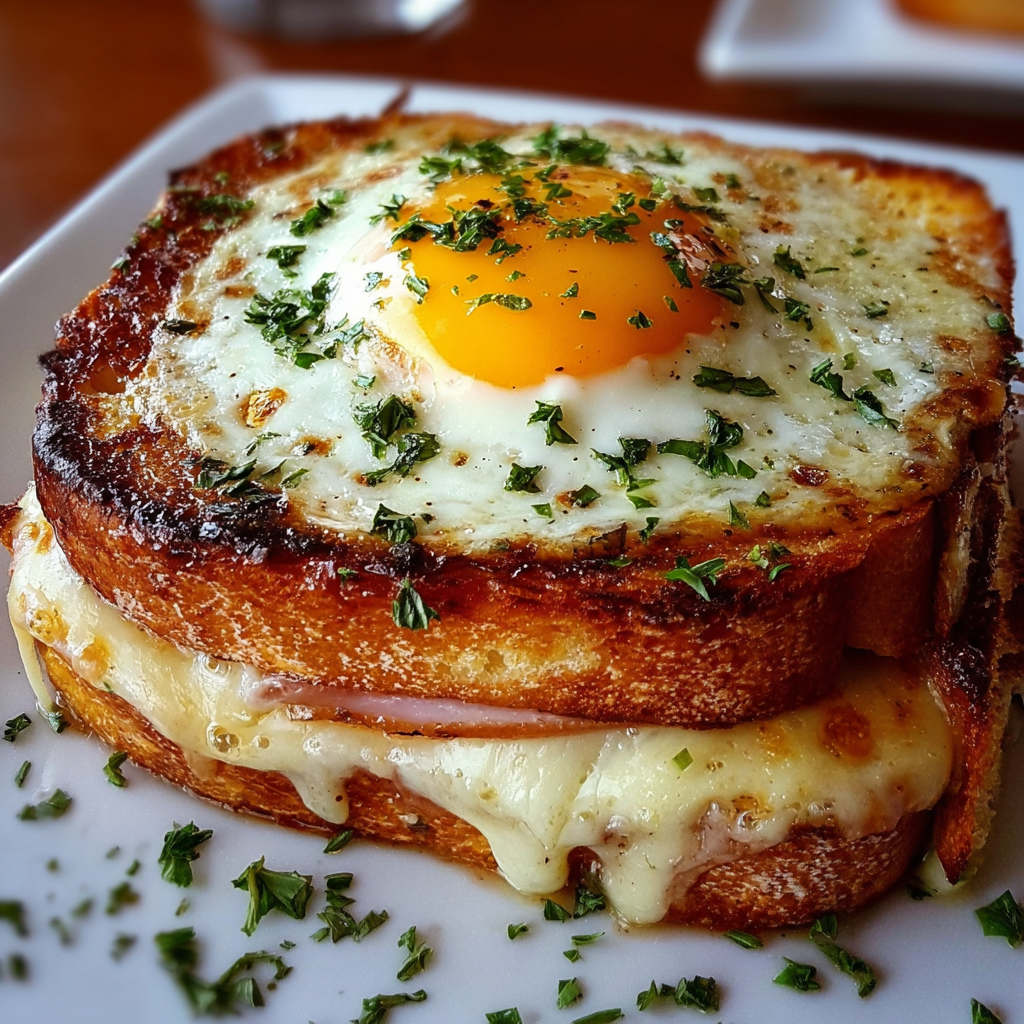- Assemble and serve: Once your sandwich is ready, carefully place the fried egg right on top of that beautiful Croque Madame. Add a sprinkle of freshly chopped parsley for color and serve it warm and straight from the oven.