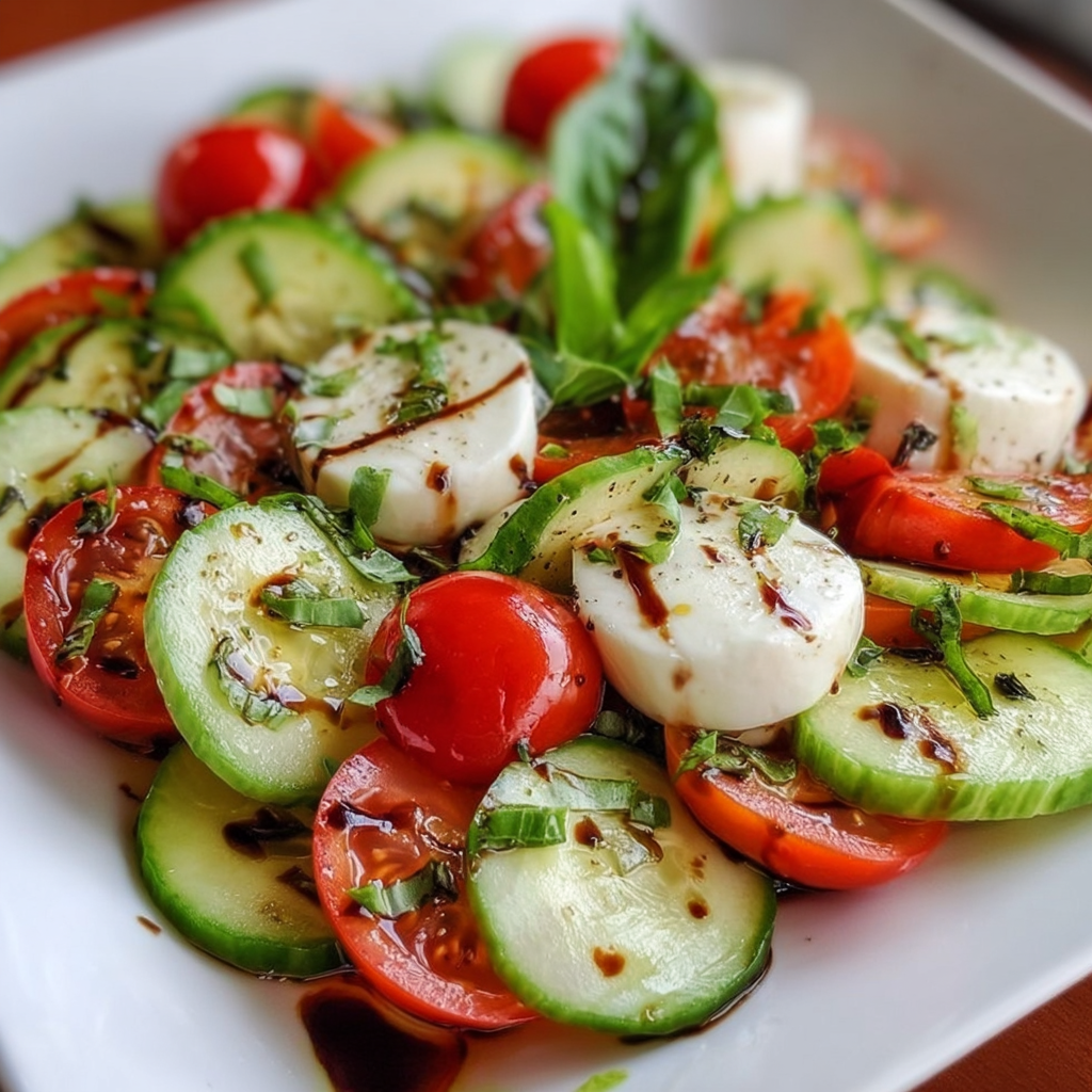 This salad isn’t just tasty; it’s packed with nutrients that your body will thank you for. Cucumbers are super hydrating since they’re mostly water, making them perfect for staying refreshed. Tomatoes bring in a great dose of vitamin C and antioxidants like lycopene, which are fantastic for your skin and heart health. And let’s not forget fresh mozzarella, which adds protein and calcium to keep your bones strong. Drizzled with olive oil and balsamic vinegar, this salad also provides good healthy fats and a burst of flavor without adding any heaviness.