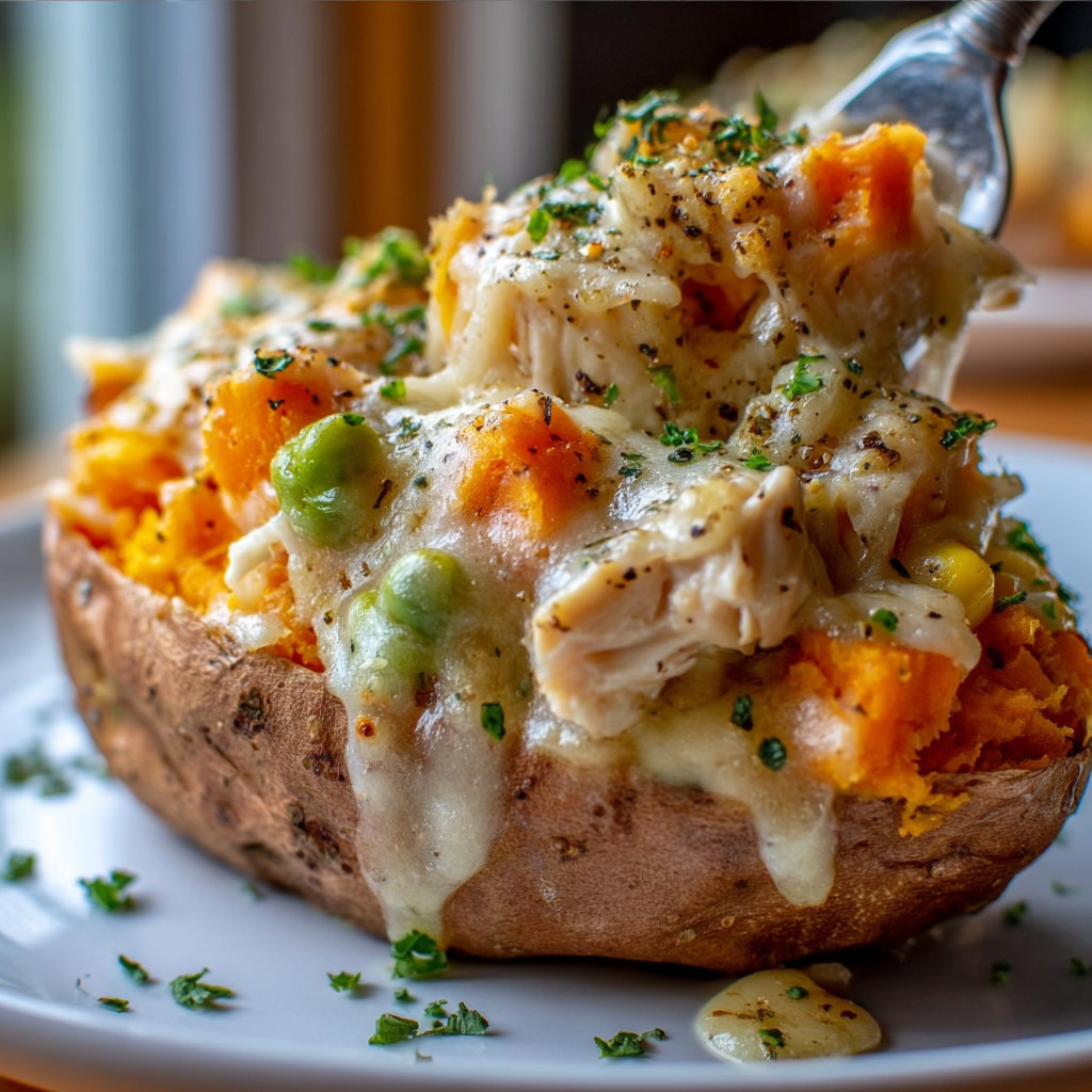 - Fill each sweet potato half with the chicken pot pie filling. If you’re feeling fancy, sprinkle some shredded cheese on top—because who doesn’t love melted cheese?