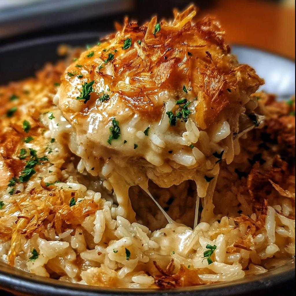 Hey there! If you’re anything like me, sometimes you want a meal that feels warm and comforting but doesn’t take forever to prepare. That’s why I absolutely love this cheesy chicken and rice recipe. It’s one of those magical dishes that combines tender chicken, savory caramelized onions, and creamy melted cheese all in one pan. Plus, the crispy fried onions on top add a fun crunch that makes every bite special.