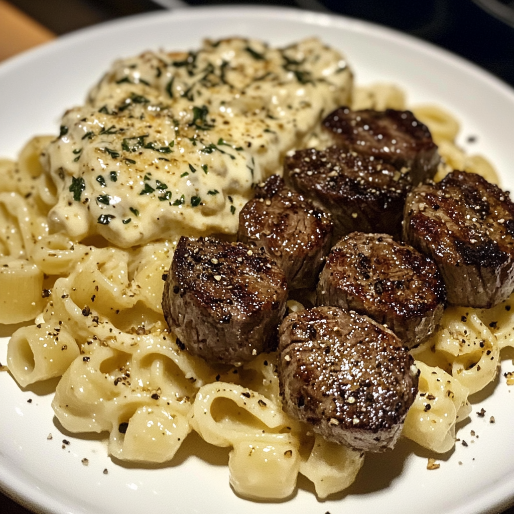 Garlic Butter Steak Bites with Creamy Parmesan Pasta Recipe