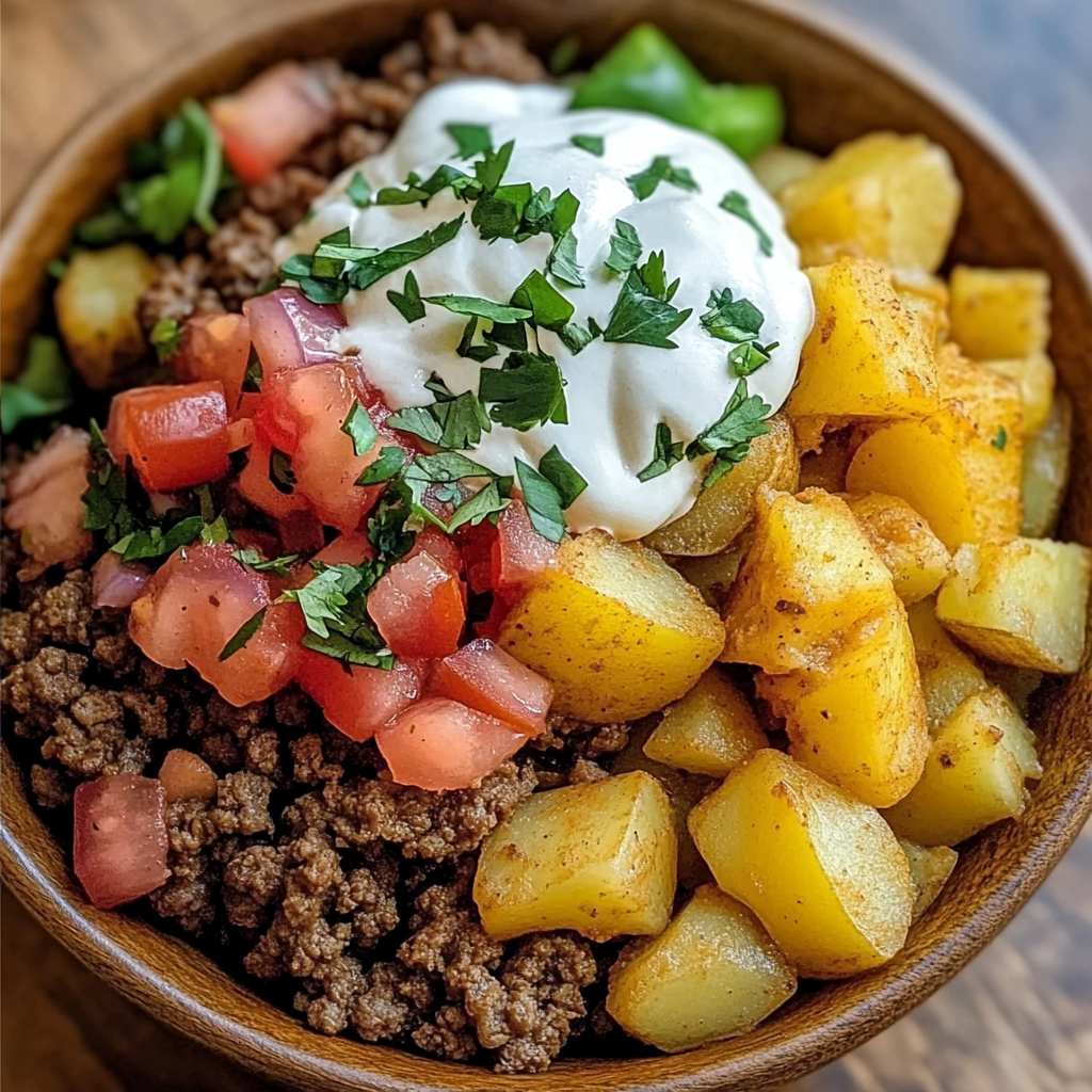 First off, let’s talk nutrition! This taco bowl packs a punch with ground beef being a great source of protein, which helps keep you full and satisfied. The addition of potatoes gives you those needed carbs for energy, while the corn and tomatoes add some fiber and vitamins. And don’t forget about the fresh cilantro—it’s full of antioxidants! Enjoying this bowl means you get a balanced meal without even trying too hard.