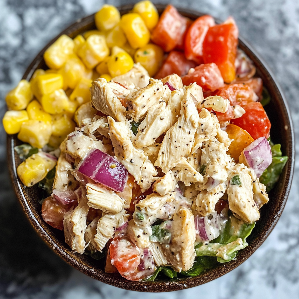 - Combine Base Ingredients: In a large mixing bowl, put in the chopped lettuce, diced chicken, halved cherry tomatoes, diced red onion, and diced bell peppers. It’s a beautiful sight!