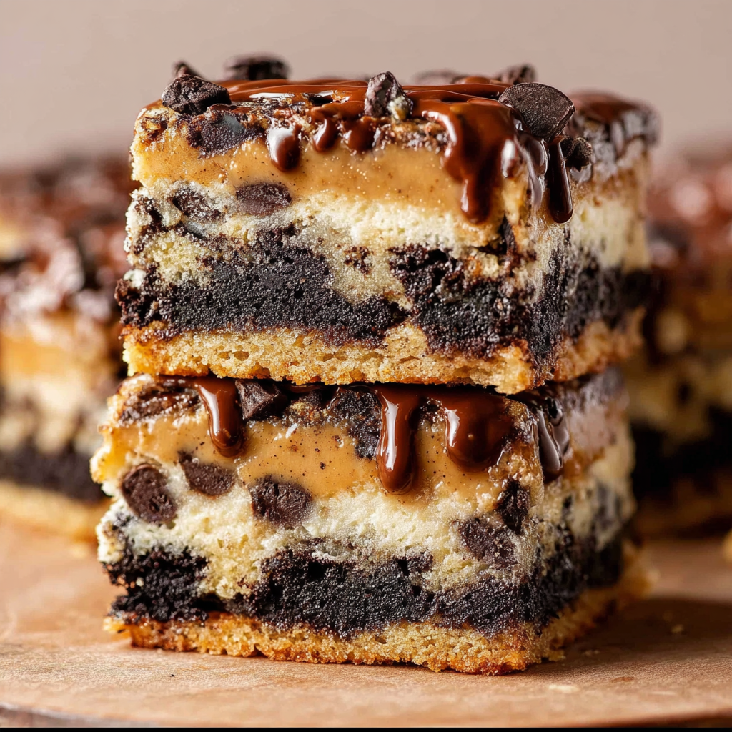 If you’re like me and have a sweet tooth that craves more than just one cookie flavor, then this recipe is going to become your new obsession. Imagine three luscious layers working together—a classic chocolate chip cookie dough base, a rich fudgy chocolate middle, and a creamy chocolate chip cookie dough topping. Oh, and don’t forget that chocolate drizzle on top to put it all over the edge!