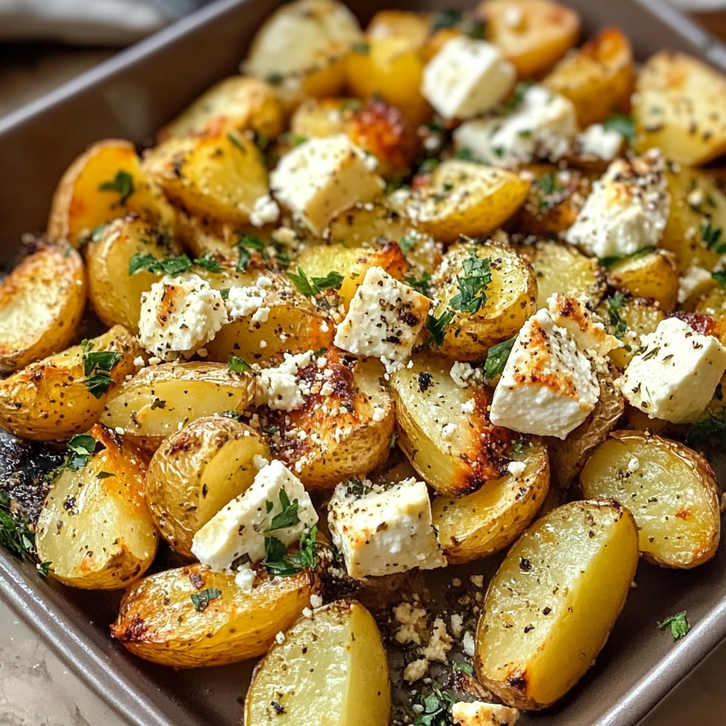 - Bake for 30-35 minutes or until the potatoes are crispy on the outside and tender on the inside, and the feta is soft and slightly golden.