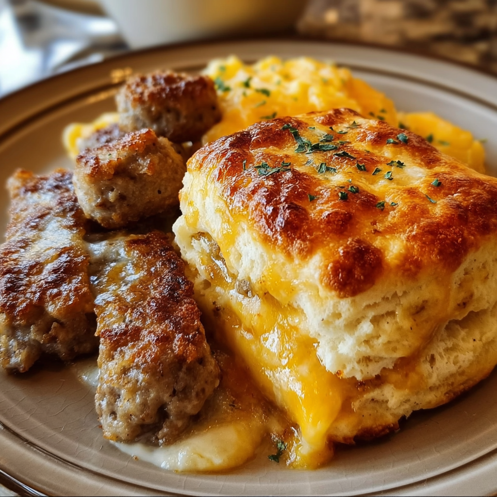 - Now, you’re ready to serve those warm, cheesy biscuits with the browned sausage and creamy scrambled eggs. Don’t forget to garnish with some fresh parsley or chives—they add a lovely pop of color!