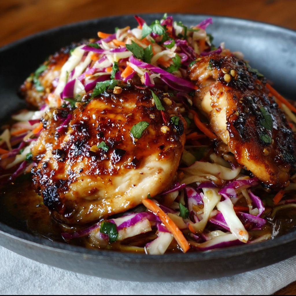 - Rest and serve: Take the chicken off the heat and let it rest for a few minutes. Then, arrange a bed of your crisp autumn slaw on each plate, top with those sticky chicken thighs, and drizzle any remaining glaze from the pan over the top. Garnish with more fresh herbs if you like!