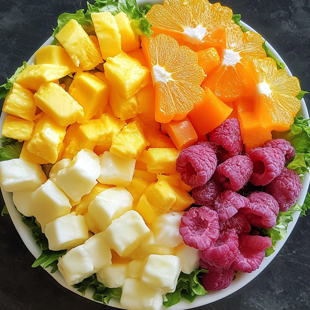 - Arrange the Fruits: Now the fun part! Neatly arrange the diced pineapple, orange segments, and mango on top of your lettuce. I like to do this in sections to keep it colorful and visually appealing!
