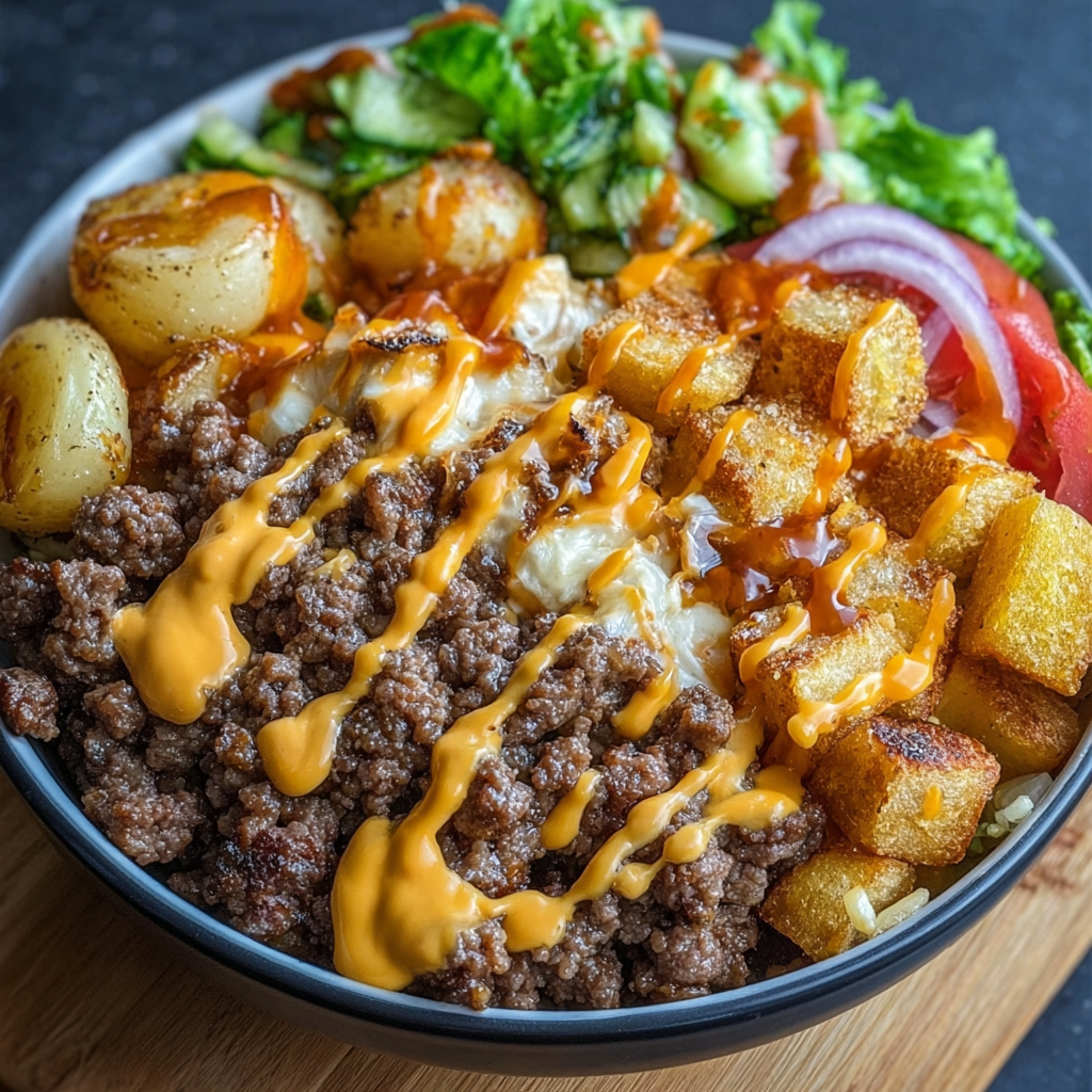 One of the things I love about this recipe is how it balances indulgence with freshness. You get the juicy, caramelized burger flavor with melted cheddar, but instead of a bun, it’s inside a bed of crisp lettuce and crispy potato cubes. The sauce brings everything together with a spicy, tangy kick.