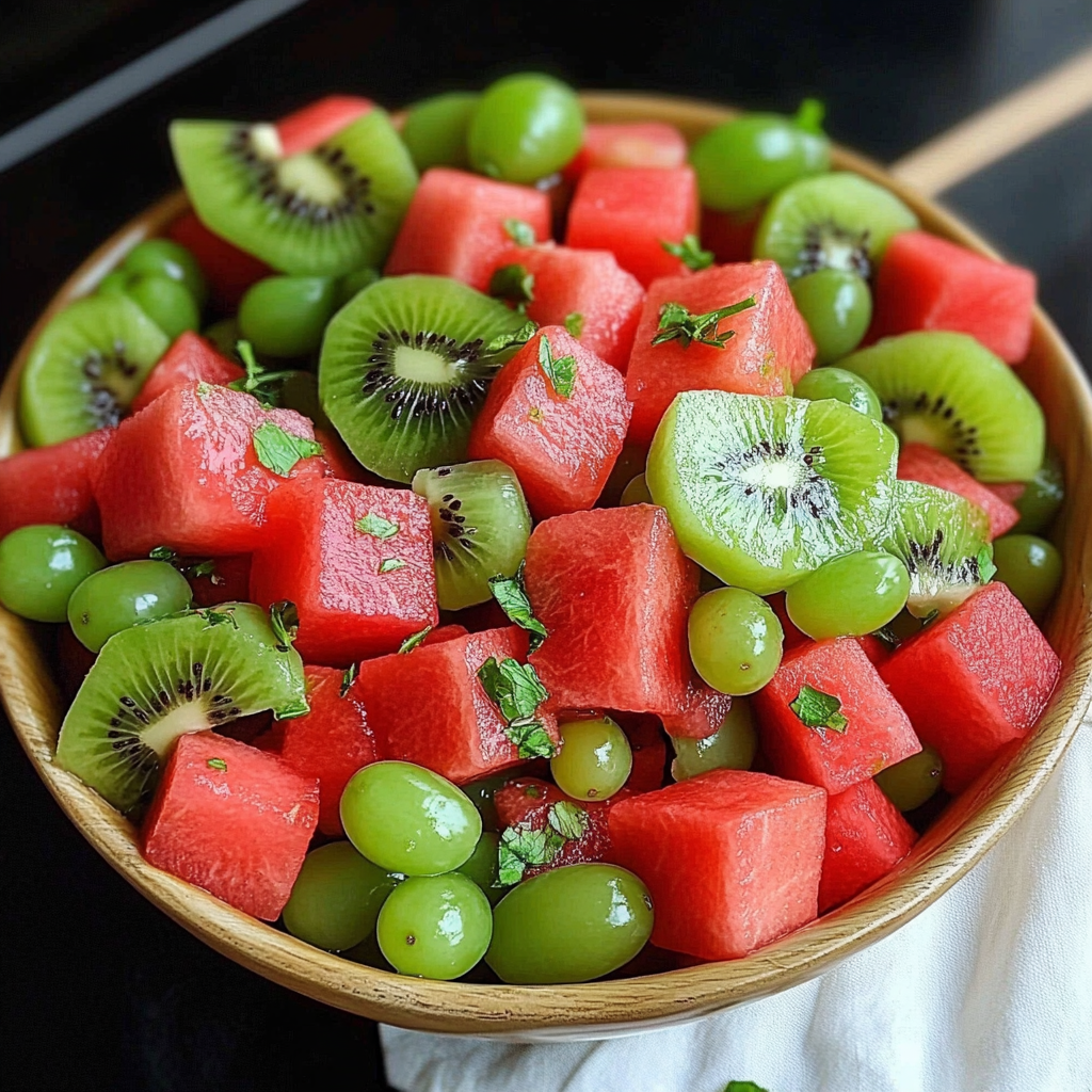 This salad is a delightful way to enjoy fresh fruits, and it comes loaded with nutritional goodness! Watermelon, for instance, is 92% water, making it a fantastic hydrator—especially in hot weather. It’s also rich in vitamins A and C, which are great for your skin and immune system. On the other hand, kiwis are tiny nutritional powerhouses packed with vitamin C, fiber, and antioxidants that may help with digestion. Green grapes add a sweet crunch and are low in calories while providing nutrients like potassium and vitamin K. Together, they form a colorful medley that not only looks pretty but is also healthy!