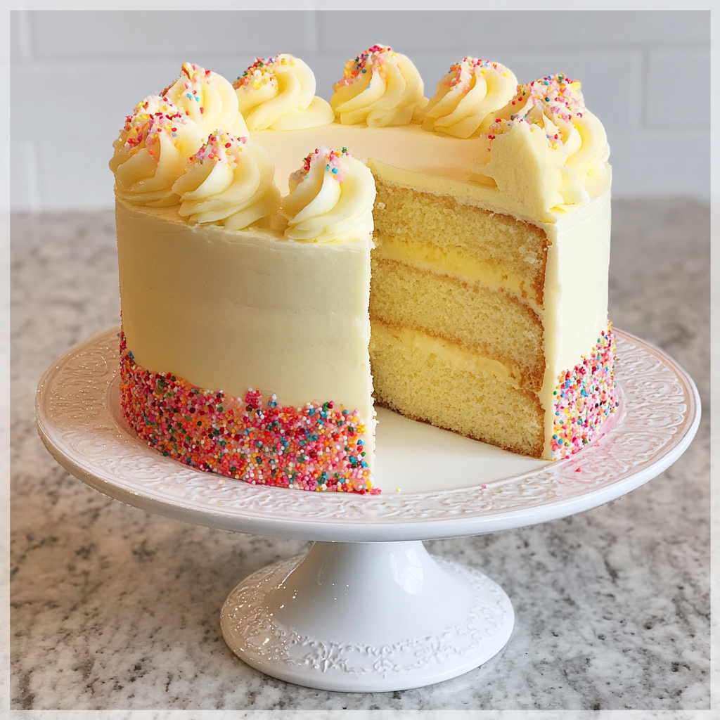 - Decorate with Sprinkles: Press sprinkles onto the bottom edge of the cake and pipe decorative swirls on top using additional frosting.